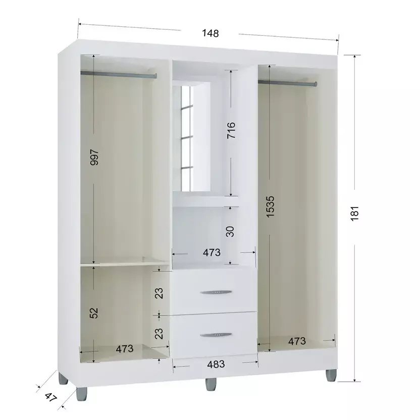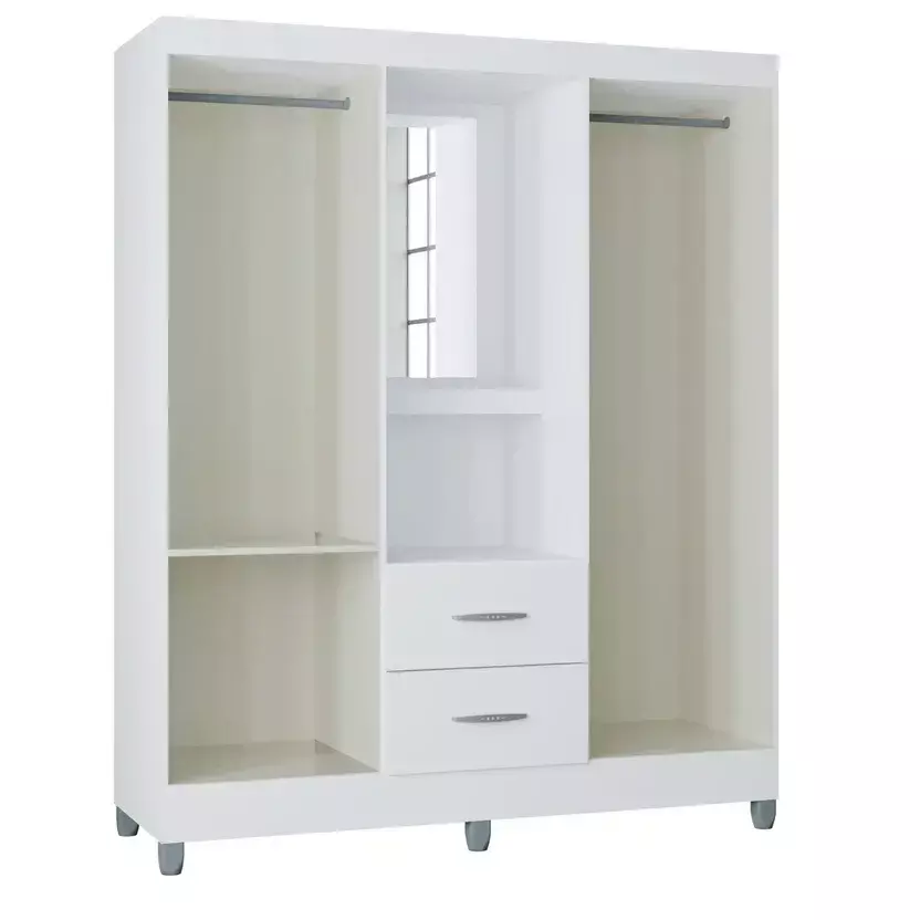 Cuenta con cuatro puertas y dos cajones, proporcionando amplio espacio para organizar tu ropa y accesorios. Su interior está optimizado con doble barra para prendas colgadas y múltiples compartimentos abiertos para doblados, bolsos o elementos decorativos.