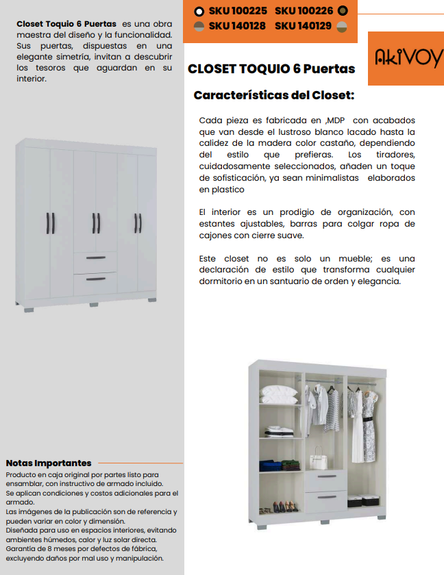 Cada pieza del Closet 6p Toquio Castaño está fabricada en MDP con acabados que varían desde el lustroso blanco lacado hasta la calidez de la madera color castaño, adaptándose a tu estilo. Los tiradores minimalistas, elaborados en plástico, añaden un toque de sofisticación discreta.