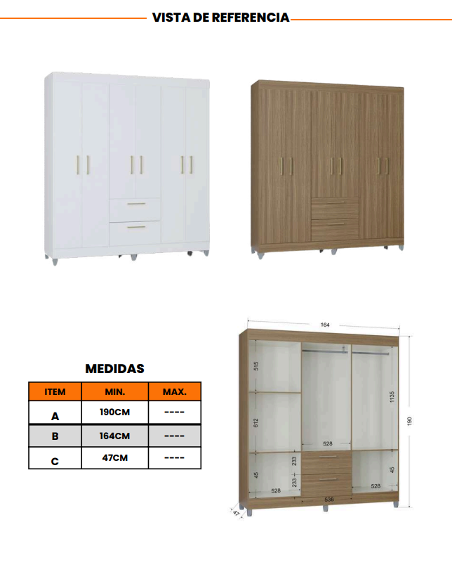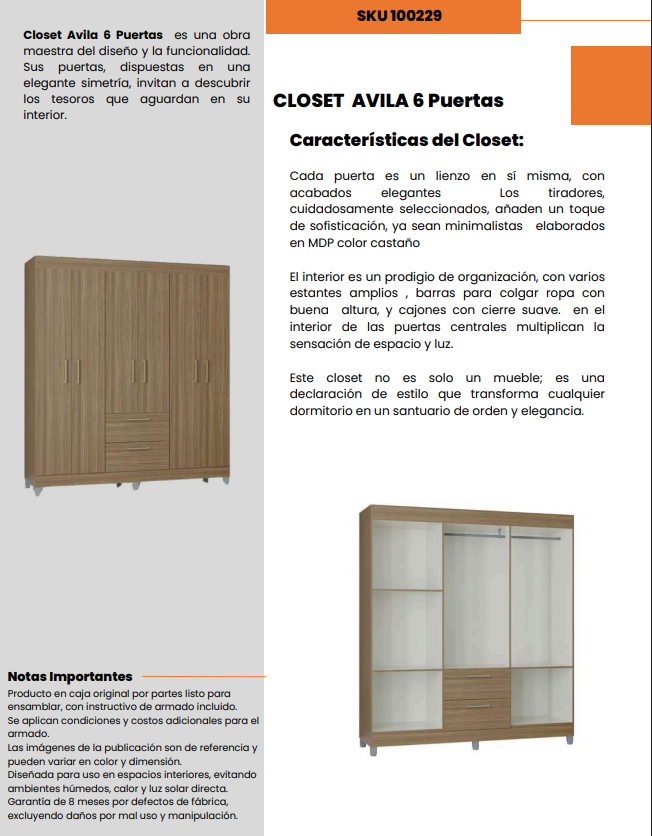 La combinación de materiales de calidad y su acabado en castaño hacen que este mueble sea una opción duradera y estética para cualquier habitación. Optimiza tu espacio con el Closet 6P2C Ávila y disfruta de un ambiente ordenado y armonioso.