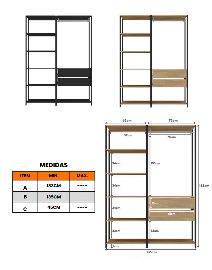 Fabricado con una estructura metálica resistente en color negro, este closet abierto es ideal para quienes buscan un mueble duradero y con diseño contemporáneo. Cuenta con un tubo metálico para colgar tus prendas favoritas y varios compartimentos abiertos para organizar ropa doblada de forma práctica y accesible.