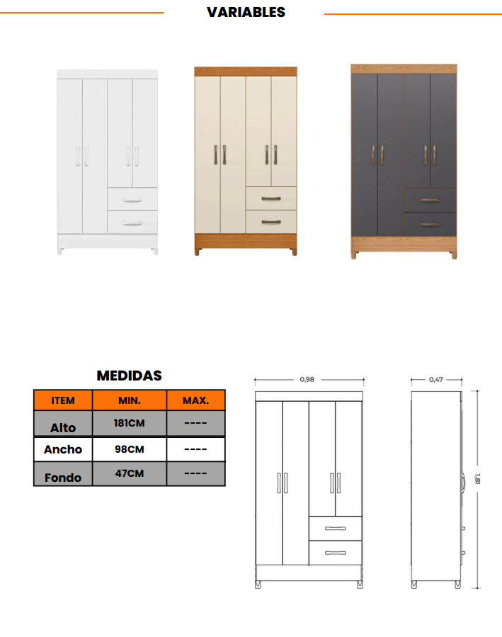 Cada pieza del Closet Mobi 4 Puertas Titanium está fabricada en MDP de alta calidad, garantizando durabilidad y resistencia. Los tiradores, cuidadosamente seleccionados, aportan un toque de sofisticación con su diseño minimalista en plástico, que complementa perfectamente cualquier estilo.
