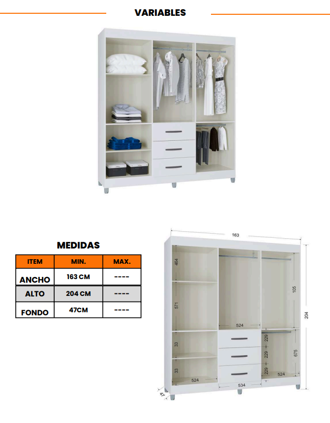 Sus amplios compartimentos y cajones te permiten guardar ropa, calzado, bolsos y objetos decorativos sin preocuparte por el espacio. El acabado blanco proporciona luminosidad, facilitando la combinación con cualquier estilo de decoración.