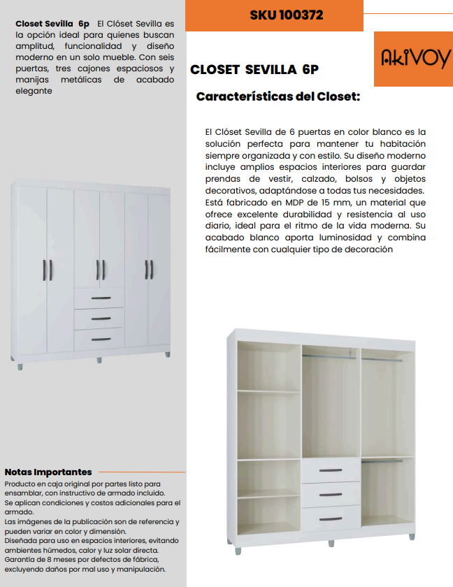 Ideal para quienes buscan funcionalidad y estética, el Clóset Sevilla es la solución perfecta para optimizar tu espacio con elegancia y practicidad.