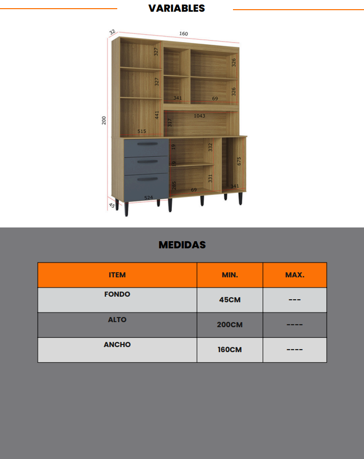 Cuenta con 2 cajones y 6 gavetas espaciosas, ideales para almacenar utensilios, alimentos no perecederos y mantener tu cocina ordenada. Además, su práctico espacio tipo estantería te permite organizar de forma accesible todo lo que necesitas.