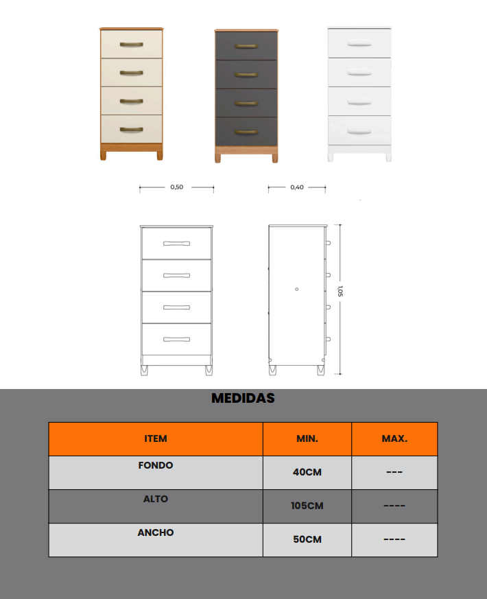 Con líneas sencillas y acabados en blanco neutro, esta cómoda se integra fácilmente a cualquier decoración, ofreciendo versatilidad y elegancia. Los cuatro amplios cajones permiten mantener tus objetos personales ordenados y accesibles.