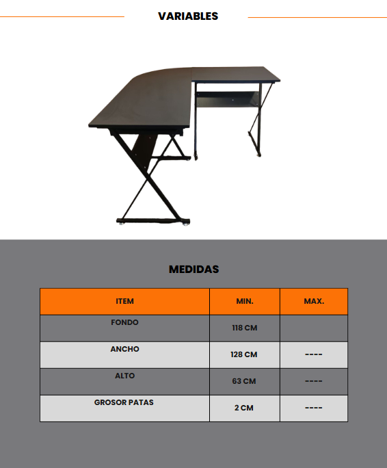 Este escritorio cuenta con una estructura metálica en color negro, que le aporta robustez y durabilidad, ideal para un uso diario. Su superficie está elaborada en MDP de 1,5 cm, recubierta con melamina de 0,15 cm y una capa UV que protege contra los rayos del sol, asegurando que el acabado se mantenga impecable y facilitando su limpieza.