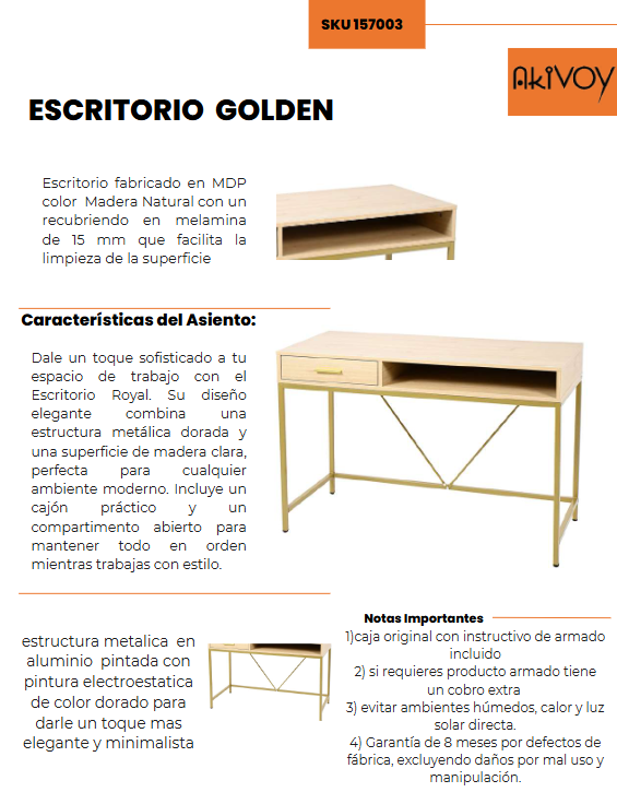 Transforma tu oficina o espacio de estudio con el Escritorio Golden, la mezcla perfecta entre estilo, resistencia y comodidad para potenciar tu productividad con un toque de lujo.