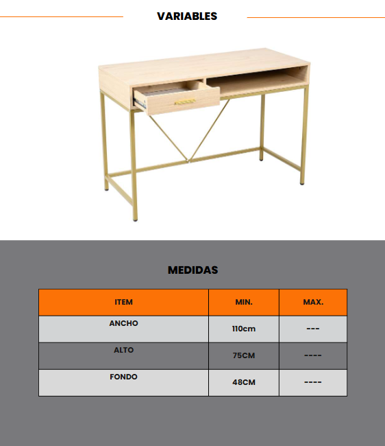 SKU: 157003 Color: Madera Natural con estructura dorada Material: MDP y aluminio Dimensiones: 110 x 48 x 75 cm