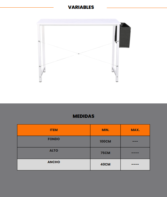 - Dimensiones ideales: 100 cm de largo x 75 cm de alto x 40 cm de ancho, ofreciendo un espacio cómodo para tus actividades diarias.