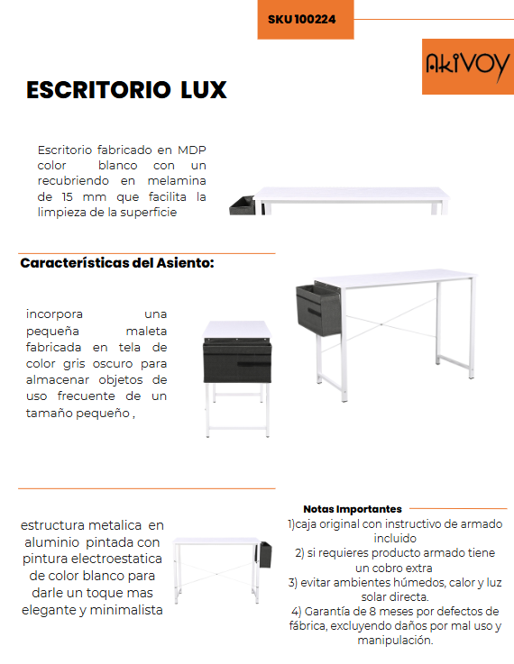 Este escritorio es la opción perfecta para quienes buscan una solución elegante y funcional que facilite el trabajo o estudio diario. Su diseño compacto y materiales de alta calidad garantizan un mueble duradero y fácil de mantener.