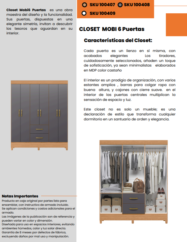 Cada puerta de este ropero es un verdadero lienzo, terminado en un elegante color blanco con tiradores minimalistas en MDP color castaño, que aportan sofisticación y estilo. Su diseño con puertas centrales biflex multiplica la sensación de espacio y luz, transformando cualquier habitación.