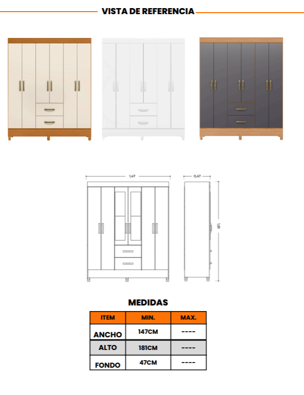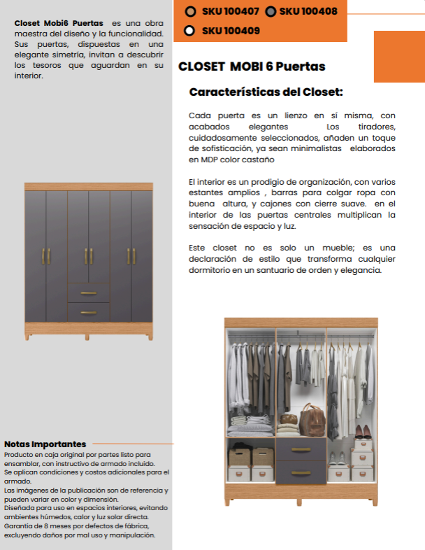 Cada puerta de este ropero es un lienzo con acabados elegantes que realzan cualquier espacio. Los tiradores minimalistas, elaborados en MDP color castaño, aportan un toque de sofisticación y estilo moderno.