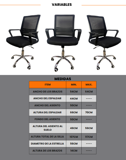 El asiento y el cabecero están tapizados en tela de malla, ofreciendo una excelente ventilación y comodidad durante largas jornadas. Además, el espaldar combina soporte en polipropileno con tela en malla para mayor soporte y transpirabilidad.