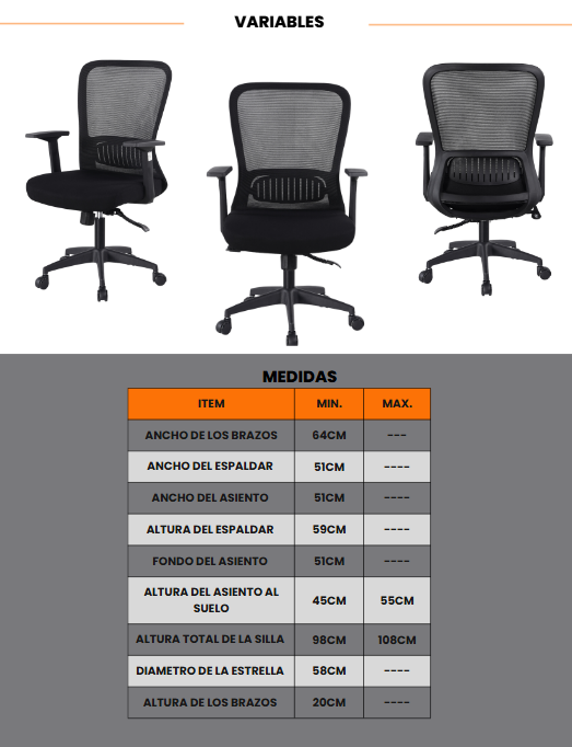 Además, incorpora un sistema basculante con tensor y reclinación ajustable con bloque para mayor confort. La base de 5 aspas en polipropileno reforzado con ruedas de silicona certificadas BIFMA asegura movilidad silenciosa y resistencia.