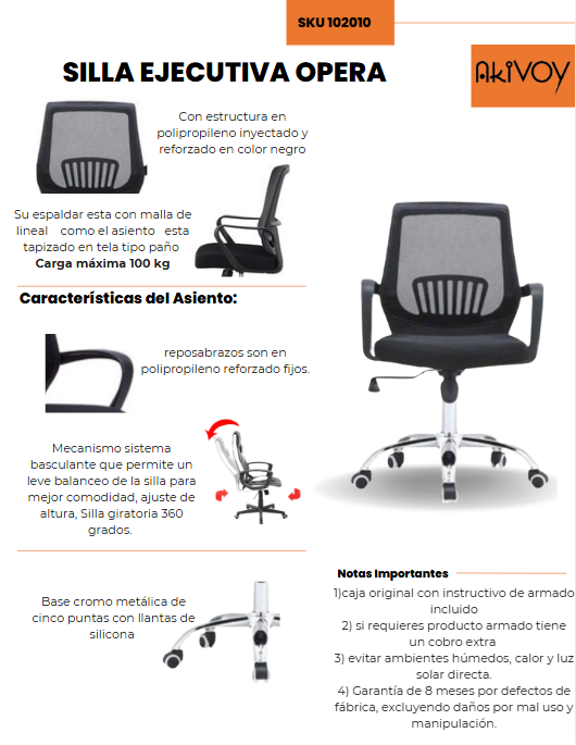 Su diseño elegante y sofisticado complementa cualquier oficina ejecutiva, mientras que su estructura robusta garantiza durabilidad y soporte óptimo. Además, la Opera ofrece ajustes personalizados para adaptarse a tus necesidades, promoviendo productividad y bienestar.