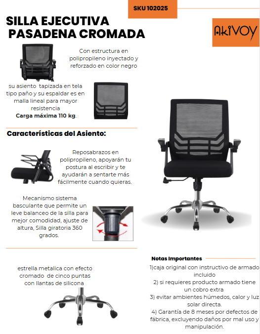Dale a tu oficina un toque moderno y funcional con la Silla Ejecutiva Pasadena, perfecta para largas jornadas de trabajo con máximo confort. [/tab]