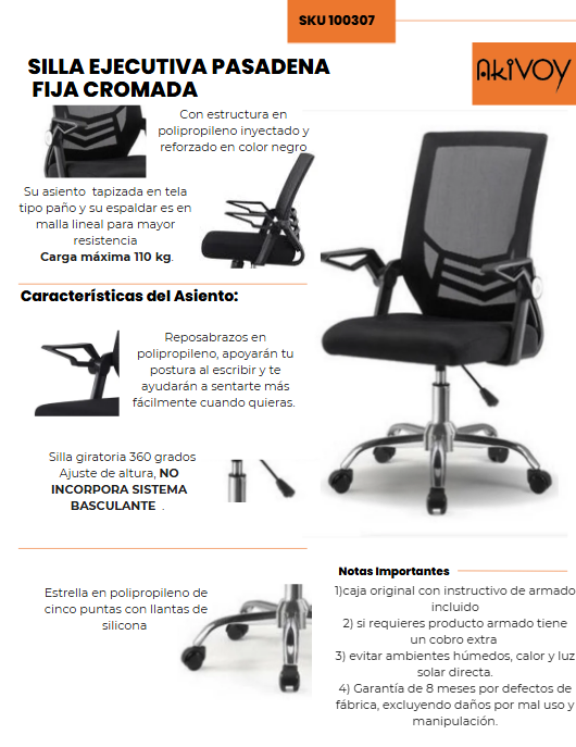 Silla Ejecutiva Pasadena Plato fijo y Base Cromada: comodidad y estilo para tu oficina