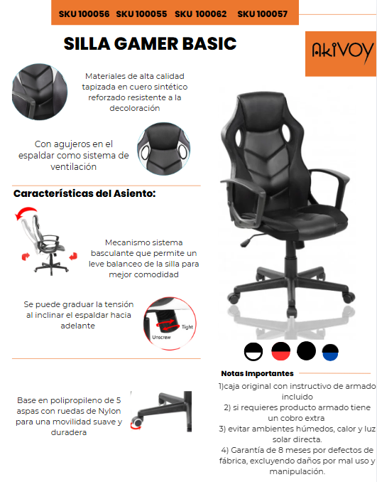 Tapizada en cuero sintético reforzado y tela malla nylon resistente a la decoloración, esta silla combina durabilidad y fácil limpieza. Además, cuenta con un sistema de ventilación a través de agujeros en el respaldo que mantiene la frescura durante su uso.