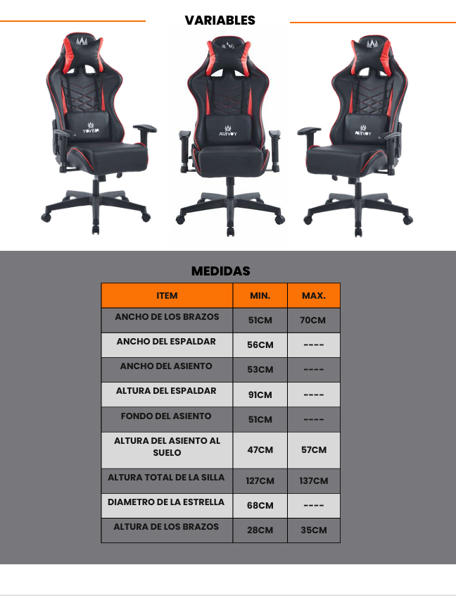 - Descansabrazos 2D que puedes modificar en altura, profundidad y ángulo, personalizando tu experiencia.