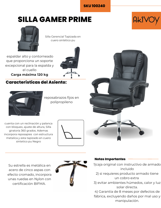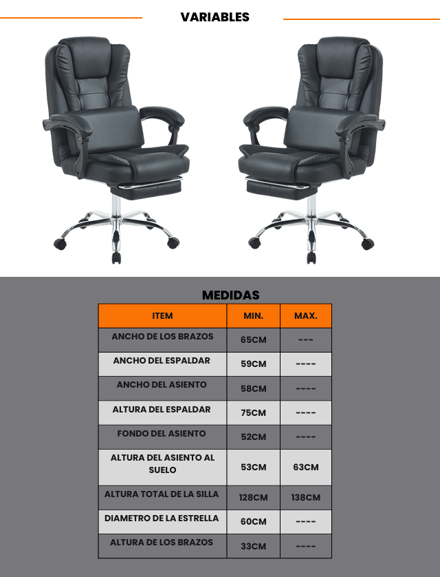 Además, cuenta con un reposapiés tapizado que brinda un toque extra de confort. Su base metálica en estrella con acabado cromado no solo aporta resistencia, sino también un estilo sofisticado y dinámico.