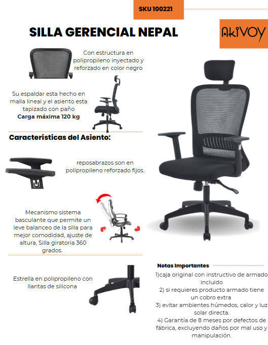 Descubre la Silla Gerencial Nepal, diseñada para brindar comodidad y estilo en ambientes ejecutivos. Su respaldo está tapizado en malla de nueva generación lineal color negro, que ofrece frescura y soporte ergonómico.