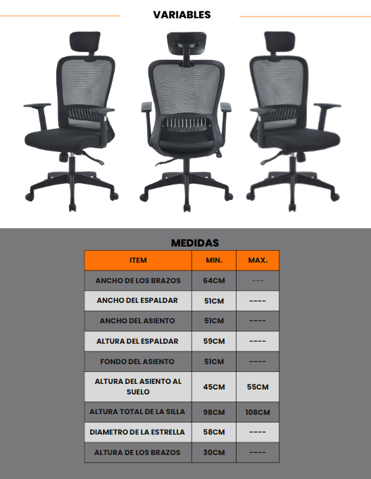Cuenta con un sistema hidráulico certificado BIFMA clase 2 para ajuste de altura mediante palanca, además de bloqueo de posición y sistema basculante con tensor para mayor ergonomía. Su base de 5 aspas en polipropileno reforzado incluye ruedas de silicona certificadas BIFMA, que facilitan el movimiento sin dañar el piso.